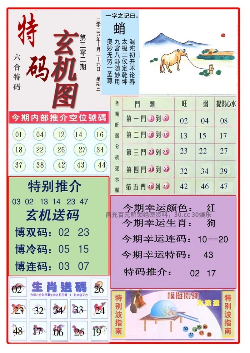 302期:玄机特码 解:图中一语定乾坤可解阳性:牛虎兔羊猴鸡 综合:牛虎兔羊猴鸡 |